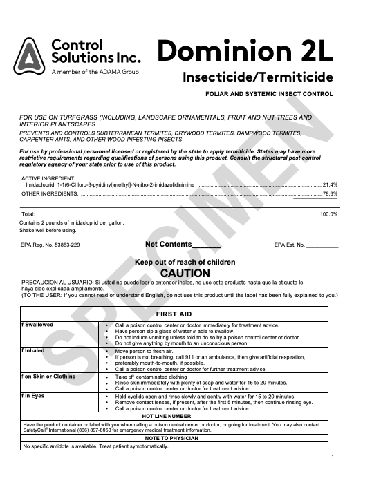 Dominion pesticide is safe only after it is completely dry. Do not use around pets or children. Wear appropriate protective equipment while applying this product. Please read the label for complete safety instructions.